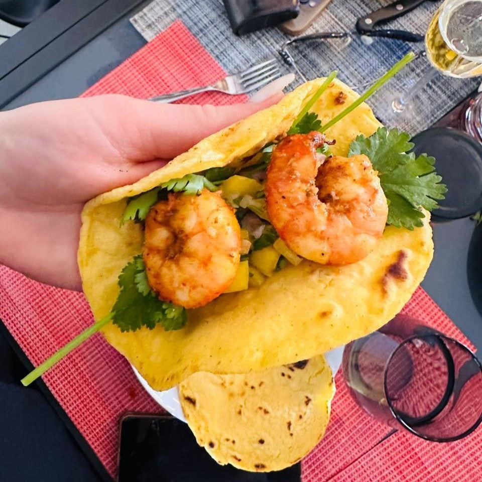 - Закрываем вечер прекрасными КРЕВЕТКАМИ и чили кон Карне . Все это заворачиваем в тортильи и супер !